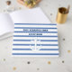 Nautical themed ship's guest book done in a white, light blue and royal blue horizontal striped pattern. A white anchor decorates the front of the book and bold blue custom text is ready to personalize.
