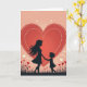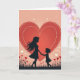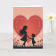 This card shows an adult figure and a small child walking hand in hand, their dark silhouettes set against a glowing gradient sky of soft coral fading into blush pink. The pair lean slightly toward each other, and the gentle tilt of their heads suggests closeness and trust ❤️. Along the bottom, dark, stylized grass stretches across the scene, dotted with simple flower shapes whose petals form small hearts like little signs of affection. In the center area sits a large crimson heart, outlined with a dashed stitch-like border that adds texture without distracting from the scene. Near the top, several small white hearts drift in the open space, echoing the heart-shaped flowers below and creating a light, dreamy balance. Any greeting text would sit neatly above the figures in a soft white tone so it stands out against the warm background, with a smaller line placed near the bottom in matching white. The adult’s long, flowing hair sweeps to one side, and the big red heart anchors the middle while tiny white hearts float overhead 🌼.