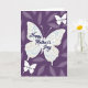 Designed with a deep violet background, this card centers on a large white butterfly whose wings are filled with lace-like curls in soft sky-blue and warm cream, creating a gentle, affectionate mood ❤️. In the middle of the butterfly, the words “Happy Mother’s Day” sit prominently in dark blue lettering, balanced and easy to read. Two smaller white butterflies float nearby, each carrying the words “My SISTER” in a matching dark blue font, hinting at a close bond like a warm hand squeeze between family members 👩. Faint leaf shapes in pale lavender drift across the purple backdrop, adding a calm garden feel without distracting from the butterflies. Light shading beneath the wings gives the impression that the butterflies are hovering just above the surface, as if they’re leaning in toward one another. The strong contrast between crisp white wings and rich purple space keeps the layout clear while still feeling soft and inviting. The overall look is framed by those translucent leaves, with the small butterflies positioned to the sides of the larger one like gentle companions.