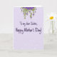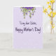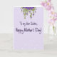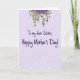This greeting card features a soft lavender background that sets a calm, affectionate mood, with tiny white stars and scattered light dots drifting across it like a quiet night sky ❤️. Centered on the front is the message “To my dear Sister, Happy Mother’s Day!” written in deep plum lettering with a loose, flowing look that feels like a note from someone close. The text sits in the middle with generous space around it, drawing your eye in and giving the words room to breathe. From the top edge, a gentle garland of violet flowers and slim green leaves spills downward, as if leaning in to frame the message like an embrace. The blossoms are rounded and clustered, and their purple tones echo the lettering so everything feels naturally connected. The overall layout suggests closeness and friendship through the way the flowers curve toward the words, like a tender gesture 🌼. Along the upper area, the floral clusters taper into smaller sprigs, with a few leaves pointing diagonally toward the center text.