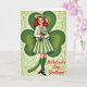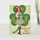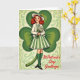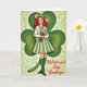 This greeting card features a vintage-style illustration of a smiling young woman with red hair in soft curls, looking as if she’s just stepped into a friendly St. Patrick’s Day scene 💚. She wears a white hat trimmed with a green ribbon and a jaunty yellow plume, and her bright eyes and gentle smile give her a warm, inviting presence. Her outfit includes a white cardigan over a shirt with a green collar, a green-and-cream striped pleated skirt, knee-high green stockings, and black Mary Janes, all set against rich green tones ☘️. She holds a small bouquet of white blossoms close to her chest, as though saving them for someone special just out of view. Behind her, a large stylized shamrock fills most of the background in deep green, creating a cozy setting that frames her like a friendly embrace. A lighter lime-green base with subtle Celtic-style patterning sits beneath, and the edges look slightly worn for an aged postcard look. In the lower right corner, the words “St. Patrick’s Day Greetings” appear in bold red lettering, standing out clearly against the green. The oversized shamrock curves around her shoulders while the patterned lime-green area spreads across the bottom like a decorative band.