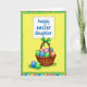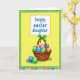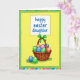This card features a spring scene framed by alternating pastel stripes in pink, blue, green, and yellow, followed by a deep green band around a sunny yellow center. In the middle sits a brown wicker basket with an arched handle, topped with a neatly tied green ribbon that feels like a gentle gift between loved ones. The basket is filled with decorated egg shapes in soft tones like rose, peach, and light blue, alongside a few with crisp blue-and-green stripes for contrast. Two more patterned eggs rest near the base of the basket, tucked into simple blades of green grass, adding a cozy, together-at-home mood 🐰. Near the top, a white rectangle with rounded corners holds the message “happy easter daughter” in curving blue lettering. The placement leaves plenty of open yellow space around the words, keeping the greeting easy to spot while the basket below feels like it’s being presented with care 🌷. The ribbon loops sit centered on the handle, and the green bow stands out sharply against the warm yellow background.