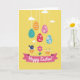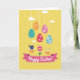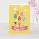 This greeting card features a spring scene set on a diagonal-striped yellow background that feels sunny and light 🌷. Near the top, five decorated egg shapes hang from thin white strings, like gentle ornaments floating in the air. Their patterns mix tiny floral sprays in pink, teal, and red with zigzags and dotted accents in orange, creating a lively, friendly rhythm across the page. Soft, cloud-like shapes sit between the hanging eggs, giving the space an airy look, as if everything is drifting together. At the bottom, two stylized baby birds peek out from cracked shell pieces, one in bright blue and the other in warm yellow, leaning toward each other with a tender, companionable closeness 🐰. Between them stands a single flower on a slim green stem, with fuchsia petals and a small golden center. Along the very bottom, a wide fuchsia banner with dashed white “stitch” marks holds the greeting text in white lettering centered across it.