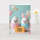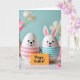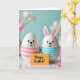 This design shows two white, egg-shaped figures standing close together against a cool turquoise background, their rounded dark eyes and small smiles turned slightly toward one another in a way that feels quietly affectionate 🐰. Soft pink blush circles warm their cheeks, and one figure has upright pointed ears with pink inner details, hinting at a spring bunny look 🐇. The lower half of one egg is wrapped in pale pink horizontal stripes, while the other wears light sky-blue stripes, giving them a sweet, coordinated pairing. Between them in the foreground sits a small rectangular yellow card, angled slightly upward as if being offered. The message “Happy Easter!” appears centered on the card in black lettering, easy to read against the bright yellow. Behind the pair, the background fades into a gentle blur where pale white and soft pink flowers suggest tulips, adding a tender, romantic garden feel. The lighting stays soft and even, highlighting the smooth, glossy surfaces of the figures and the matte look of the yellow note, with faint pink-and-white blooms drifting out of focus near the top edge.