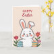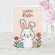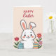 This design shows a cute white bunny 🐰 with long upright ears and soft pink inner ear details, filling the lower part of the card like it’s leaning in for a friendly hello. Its simple black eyes, small nose, and rosy cheeks give it a tender, affectionate look, as if it’s sharing a quiet moment with you. On either side sit two decorated eggs: one in teal with white wavy lines and dots, and the other striped in yellow, sky blue, and pale pink with zigzag accents. Two tall flowers frame the scene, with a red cup-shaped bloom and green leaves on the left and a red-and-purple flower with green foliage on the right, adding a gentle springtime closeness 🌷. Across the top, the word “HAPPY” appears in uppercase letters, and the seasonal greeting follows in flowing cursive-style lettering, both in a deep rose color. The background stays a soft beige, letting the bunny, eggs, and flowers stand out without feeling busy. The teal egg sits to the bunny’s left, while the striped egg rests to the right beneath the rose-colored text.
