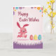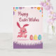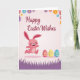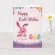 This card features a rosy-pink, long-eared bunny 🐰 leaping from left to right, its bright eyes and rosy cheeks giving it a friendly, inviting look as if it’s hurrying toward someone it cares about. Near the bunny, three decorated eggs sit to the right: one pink with yellow stripes, one yellow with a wavy pattern, and one blue with horizontal bands, each with small highlights that make them look gently glossy. The background fades from a pale blush at the top into a deeper pink, keeping the scene soft and spring-like. Along the upper edge, a row of stylized flowers in purple, blue, yellow, and orange adds a cheerful border, like a garden arch above the action 🌷. The greeting text, “Happy Easter Wishes,” appears prominently across the lower middle in flowing maroon lettering, standing out against the lighter backdrop. Beneath the words, a band of deep purple, spiky grass shapes stretches across the bottom, framing the bunny’s leap and the eggs like a shared little discovery. The lower third is anchored by that dense purple grass strip, with the eggs clustered just above it on the right side.