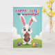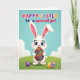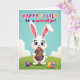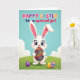 This card shows a sweet white bunny with big dark eyes, tiny lashes, rosy cheeks, and a small smile that feels like it’s meant for someone close 🐰. Its tall ears tip slightly, showing soft pink inside, as it lifts a decorated oval treat with rich brown coloring and diagonal bands of red, blue, orange, and pink dotted with white. Behind the bunny, an airy blue sky holds a few puffy white clouds, setting a calm spring scene. Along the bottom, rolling green grass is sprinkled with small white and orange flowers, like a little path made for sharing a gentle moment 🌷. Nearby sit more patterned ovals: one deep purple with lighter stripes, one golden yellow with tiny star-like specks, and one red-and-white striped with a blue ribbon, arranged like thoughtful gifts. Across the top, the words “HAPPY EASTER to a special girl” appear in rounded letters, with “HAPPY EASTER” larger and “to a special girl” smaller beneath it, all in mixed bright colors. The shading stays soft and smooth, giving the bunny’s fur a tender look and making the scene feel friendly and affectionate. The upper text spans the sky area while the bunny stands centered above the grassy hill with the patterned ovals clustered near its feet.
