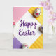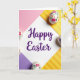 Designed with a centered white diamond, the card features the words “Happy Easter” placed in the middle in deep purple lettering. Plenty of white space around the message keeps the focus on the greeting while giving the layout an airy, open look. The background is divided into four angled color panels, with soft pink in the upper left and gentle lilac in the lower left. On the right side, two sunny yellow sections add warmth, and faint diagonal stripes create a light sense of movement like a shared laugh between friends 🌷. At the top, bottom, left, and right points of the design, four glossy oval eggs overlap the colored panels as if they’ve been set there with care 🐰. Each egg is white with small floral clusters in fuchsia, violet, and orange, linked by leafy green stems that curl and cross like an affectionate embrace. The yellow panels show subtle parallel diagonal lines behind the eggs, while the purple text sits neatly within the diamond.