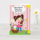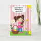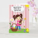 This card shows a cheerful illustrated young girl with dark pigtails tied with pink bows, rosy cheeks, and a wide open smile as she faces forward like she’s sharing a sweet moment with a friend. She holds a brown long-eared treat in one hand and offers a bright yellow flower with a green stem in the other, adding a gentle, affectionate touch 🌷. Behind her, the background is filled with vertical pink-and-white stripes, while the ground is a rich green like fresh spring grass. Off to her left sits a woven basket packed with decorated eggs and a small white bunny figure with upright ears 🐰. Nearby, a tall white daisy with a golden center stands beside a tiny yellow chick and a single striped egg resting in the grass. Above the girl, a pale cloud-shaped bubble contains the greeting text in dark lettering, centered inside the bubble. In the top area, a golden sun with triangular rays shines near two small striped flying insects.