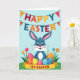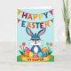 This design shows a blue bunny with pink-lined ears smiling straight ahead, giving the scene a friendly, affectionate feel 🐰. Around the bunny, striped egg shapes in many colors sit in a patch of green grass, like little gifts gathered close together for company. Small flowers rise from the grass in simple shapes, with bright petals that add a gentle, romantic touch like a bouquet left on purpose 🌷. Across the top, a banner of multicolored pennants stretches from side to side, and large uppercase letters in a strong, dark color spell a spring holiday greeting. Near the bottom, a golden ribbon curls outward with a short line of text in a darker contrasting shade, suggesting a first-time celebration. The background stays a soft pastel blue, letting the brighter colors stand out without feeling harsh. The bunny’s rounded face and the neat edges of the eggs and flowers keep everything easy to read and visually sweet. The banner hangs above the bunny while the ribbon sits below, framing the center with color and tidy shapes.