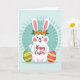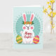 Designed with a pale mint background, this card features a stylized white bunny centered in the scene, smiling with rosy cheeks and a friendly, welcoming look 🐰. Its long ears are tinted soft pink inside, and a leafy green crown dotted with small orange flowers sits between them, adding a gentle, affectionate touch. Across the bunny’s chest, a short seasonal greeting appears in bright red lettering, placed horizontally and easy to spot at first glance. Near the bottom, two decorated eggs sit on either side like cheerful companions, arranged to frame the bunny and suggest a shared celebration 🌷. The left egg is green with yellow bands, tiny red details, and fine cross-hatched patterning, while the right egg is magenta with yellow stripes, orange zigzags, and dotted accents. Behind the bunny, a teal circle creates a soft halo effect, with lighter abstract shapes inside that keep the focus on the central figure. The overall palette mixes gentle pastels with richer reds and oranges, and the bunny’s small fluffy tail peeks out subtly near the lower edge. A teal circular frame sits behind the bunny, floating on the mint background with faint, lighter shapes layered inside it.