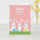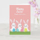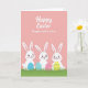 This card features a soft pastel pink background that feels gentle and inviting 🌷. Near the top, a seasonal greeting appears in white cursive-style lettering, with a smaller dedication line set just beneath it in a lighter, slanted font. Along the bottom edge, a strip of bright green grass suggests an outdoor spring scene. In the lower half, three cute white bunny-like characters with long upright ears stand in a neat row, their rounded faces showing small smiles and rosy cheeks 🐰. Their close spacing and matching expressions give the scene a friendly, together-at-once look, like they’re sharing a quiet moment. In front of each character sits an egg-shaped decoration, adding color and detail to the foreground. One egg has blue polka dots, another shows pink floral patterns, and the third is marked with yellow stripes and small blue accents.