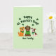 This greeting card shows three cartoon dogs lined up side by side on a light green background, leaning close as if they’re posing for a friendly family photo 💚. The left pup is orange, wearing green-rimmed glasses and a matching green bandana, giving a gentle, attentive look toward the others. In the middle, a larger brown dog also wears green glasses and a green sweater dotted with shamrocks, standing steady like the affectionate anchor of the trio ☘️. On the right, a white-and-brown patched dog wears a green sweater with horizontal stripes and flashes an open-mouthed grin, as if laughing at an inside joke. Across the top, dark green lettering reads “Happy St. Patrick’s Day!” with small shamrock accents tucked around the words. Near the lower area, the phrase “Our Family” appears in a smaller, subtle style, tying the group together like a shared nickname. The greens range from emerald to lime in the clothes and accents, while the background stays softly monochrome behind the three dogs.