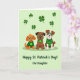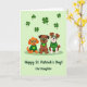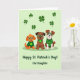This greeting card shows three cartoon dogs lined up across the lower half, leaning close as if they’re posing for a friendly photo 💚. An orange pup wears a green sweater with a shamrock on the chest, a rich brown dog sports a green bandana, and a brown-and-white dog has a striped green sweater. All three wear green-rimmed glasses, and their gentle smiles and shoulder-to-shoulder spacing suggest an easy, affectionate bond. Behind them, a light green background keeps the scene soft while small four-leaf clovers drift down from the top ☘️. The dogs sit on a lightly shaded oval near the bottom, giving them a grounded spot beneath the falling clovers. Along the very bottom edge, dark green text reads “Happy St. Patrick’s Day! Our Daughter,” centered and easy to spot. The upper background remains open and airy, dotted with scattered clovers floating above their heads.