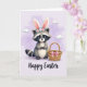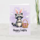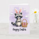 This card features a grey-furred woodland animal centered on the front, wearing tall rabbit ears with pink inner lining and a flower crown of soft coral and teal blooms 🌷. The character looks straight ahead with wide dark eyes and a small smile that feels like a gentle hello to someone close, whether a friend or a sweetheart 🐰. Its dark facial mask and softly shaded striped tail add cozy detail without looking busy. On the right side, a woven basket rests nearby, finished with a pink ribbon tied in a neat bow, as if it’s waiting to be filled for a shared spring outing. The background is a pale lavender sky with a few rounded, light clouds floating high, giving the scene plenty of airy space. At the bottom, a flowing seasonal greeting appears in a darker lavender tone, centered and easy to spot against the light background. Soft lighting and pastel colors keep the whole scene calm and sweet, like a quiet moment spent together. The basket’s weave lines and the ribbon’s loops are drawn with fine, delicate strokes beside the character.