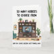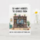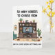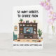 This card shows a cozy living-room scene centered on a sturdy wooden media console packed with little signs of a creative life. A cushioned teal armchair sits nearby, and leafy potted plants soften the corners, making the space feel gently lived-in 🌼. On the shelves you can spot stacked books, folded yarn, and a classic sewing machine, arranged like someone just paused their projects to spend time with family. In the middle, the television displays two animated figures leaning into a warm hug, their faces close and relaxed in a way that suggests real affection ❤️. On the floor, a bowl of red berries and a small pet item add everyday detail, like a quiet afternoon at home. The main message is split into two parts, with “SO MANY HOBBIES TO CHOOSE FROM” placed prominently near the top in dark lettering. The follow-up line, “AND YOU CHOSE RAISING ME?? THANKS, MOM.” appears below in matching text, framing the scene like a funny, thankful aside. The console’s shelves are filled with greenery, books, yarn, and the sewing machine, with the teal chair tucked to one side.