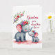 This card shows two stylized, plush-like elephants in soft gray tones, with a larger adult leaning close to a smaller youngster as their trunks meet in a gentle touch that feels quietly affectionate ❤️. Both figures have closed eyes and a light pink blush on their cheeks, giving the scene the look of a calm, caring pause between them. Each elephant wears a crown of flowers in deep red, pink, and purple with green leaves, adding a festive, romantic flourish without overpowering the soft mood. A flowering branch stretches in from the upper left, arching above them like a natural frame and echoing the same colors. Behind the pair, a rosy watercolor-style wash spreads across the background, keeping the setting airy and light 🌼. The message text sits to the right of the elephants in flowing cursive lettering, colored in a coordinating pinkish tone that stands out gently against the pale backdrop. The overall composition stays simple and balanced, with rounded shapes and soft shading that guide your eye back to their touching trunks. The flowers show layered petals in crimson, fuchsia, and violet, with small green leaves tucked between blooms along the crowns and the top-left branch.