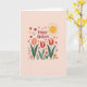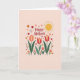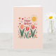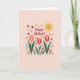 Designed with a gentle garden scene, this Mother’s Day card uses a soft blush-pink background that feels warm and tender ❤️. Centered near the top, the words “Happy Mother’s Day” appear in a rich crimson, flowing lettering that draws the eye first. Below the text, tulips fill the lower half in different sizes and stages of bloom, their petals shaded in reds and soft oranges with creamy centers that suggest a caring touch. Deep green leaves and stems spread outward, giving the flowers a grounded, growing look that hints at closeness and support. In the upper right corner, a golden sun with simple rays adds a cozy glow, like a reassuring presence watching over the garden. Small hearts in crimson, coral, and amber drift around the flowers, paired with tiny brown sprigs and little star-like marks for extra texture 🌼. The overall layout feels balanced and calm, with the message held gently above the blooms and decorations. A cluster of tiny hearts and star-like asterisks is scattered between the tulips and the sun.