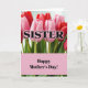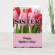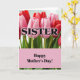This card features a tall bouquet of tulips in soft pinks and deep reds, with closed buds reaching upward as if leaning close in a gentle, affectionate cluster ❤️. Rich green stems and leaves gather at the base, giving the arrangement a grounded, garden-fresh look against a softly bright, slightly blurred background. Near the top center, the word “SISTER” appears in black serif letters, standing out clearly over the flowers. The strong lettering feels like a warm, direct address, like a close bond spoken out loud without needing extra decoration. Across the lower half, a wide pastel pink banner runs horizontally, adding a calm space that balances the busier floral area above. Centered on that banner, “Happy Mother’s Day!” is written in matching black serif text, easy to read and neatly aligned. The gentle lighting and cozy color mix suggest a caring connection, like a shared moment between family members 🌼. The tulips show smooth petals with subtle highlights, and the banner’s edges are straight and even beneath the bouquet.
