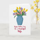 This card features a simple white background with a rounded blue vase centered on the page, holding a full bouquet that feels like a close hug between friends ❤️. Tall yellow bell-shaped flowers rise above the arrangement, leaning slightly toward one another as if sharing a quiet moment. Softer pink buds sit nearby, their closed petals adding a gentle, caring touch among the brighter blooms. Small purple flowers with radiating petals are sprinkled throughout, creating a sweet contrast against the deep green leaves that curl outward. Beneath the vase, a flowing cursive-style message appears in deep crimson red, centered and spaced comfortably below the stems. The overall look uses flat shapes and crisp edges, letting the colors feel fresh and springlike 🌼. The purple accents sit between the yellow blossoms and the pink buds, with green foliage fanning out around the base of the bouquet.
