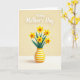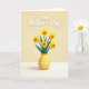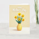Designed with a sunny floral illustration, this card centers on a bouquet of five trumpet-shaped yellow flowers with deep golden-orange centers, arranged close together like friends leaning in ❤️. Slender dark green leaves fan out behind them, adding contrast and a calm, caring tone to the scene. The flowers sit in a rounded vase decorated with horizontal stripes in yellow and soft white, giving the base a tidy, cheerful look. Soft lighting and gentle shadowing add depth, making the petals and leaves feel slightly layered rather than flat. Small confetti-like dots and tiny star shapes in pale yellow and white float around the bouquet, like a light celebration in the air 🌼. Near the top, a short message appears in white lettering with a faint shadow, centered above the flowers for easy reading. The background stays warm and muted, while the vase stripes and confetti shapes remain crisp and evenly spaced.
