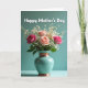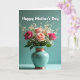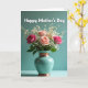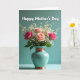 On the front of the card a vertical bouquet sits centered on a smooth teal background, creating a calm scene that feels like a quiet hug for someone you care about ❤️. Soft peach, blush, and deeper pink roses open gently toward one another, with tiny white filler blooms floating around them like light conversation between friends. The flowers are arranged in a glossy teal ceramic vase that catches highlights along its curved sides. Warm copper-toned bands wrap the vase at the neck and near the base, adding a cozy contrast against the cool backdrop. A softly lit tabletop supports the vase, and a faint shadow falls behind it to keep the arrangement grounded. Near the top, the words “Happy Mother’s Day” are placed above the bouquet in crisp white lettering, easy to read against the teal. The lighting stays diffuse and gentle, bringing out the velvety rose petals and the smooth shine of the vase 🌼. The copper bands glint subtly at the top and bottom of the vase while the teal background remains evenly toned.
