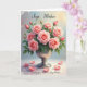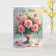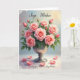 Designed with a lush bouquet of blush-pink roses, this card centers on full blooms and tender buds gathered in a polished silver chalice, like a quiet gift shared between close hearts ❤️. Soft pink petals fade from deeper centers to paler edges, while fresh green leaves peek through as if leaning in to keep the flowers company. The background shifts in a gentle gradient from cool pale blue to warm peachy yellow, creating a calm, intimate setting. A few loose petals rest on the reflective surface below, hinting at a recent touch and a lingering, affectionate pause 🌼. Tiny shimmering specks drift through the air, adding a light, celebratory sparkle without overpowering the scene. Message text sits at the top and bottom in flowing lettering, set in a dark ink that stands out against the airy backdrop. A thin, vintage-style border frames everything neatly, with the chalice and roses remaining the brightest focal point. The reflective base shows faint highlights around the scattered petals and the rounded foot of the silver chalice.