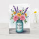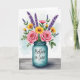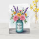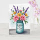 This card shows a soft watercolor-style bouquet arranged in a translucent teal glass jar, set against a pale blue wash that feels calm and affectionate ❤️. Two full pink roses sit near the center, their layered petals opening toward each other like a quiet, romantic glance. Around them, sunny yellow daisy-like blooms with deep brown centers add warmth, while slender purple flower sprigs rise through the greenery for cool contrast. The leaves in varied greens curl and overlap, creating a cozy, gathered look that suggests someone carefully chose each stem for a friend or loved one 🌼. A short message is placed on the front of the jar in small, flowing lettering, appearing in a darker teal that stands out against the glass. The jar rests on a weathered wooden plank surface, with visible grain lines running horizontally beneath the arrangement. Subtle white highlights along the jar’s rim and sides make the glass look shiny and slightly reflective.