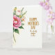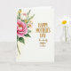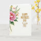 This card shows a tall spray of watercolor-style flowers running down the left side, while the right side stays mostly open and off-white for a calm, airy look. A large many-petaled bloom in fuchsia and rosy pink sits near the top with a warm golden center, surrounded by a creamy white blossom and small sunny yellow florets. Soft green leaves and stems weave between the petals, and the slightly blurred edges give everything a gentle, tender softness, like a quiet hug ❤️. The open space on the right feels like a pause in the conversation, letting the flowers “lean in” as if sharing affection with the words. The main greeting is placed toward the upper right in golden lettering, with a second, smaller line beneath it in the same golden color. The text sits comfortably away from the flowers, keeping the layout balanced and easy to read 🌼. The background remains a light off-white wash, and the floral column stays anchored along the left edge with emerald foliage tapering toward the bottom.