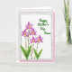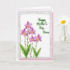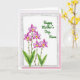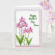 This card features a soft watercolor-style bouquet on the left, where five blossoms in fuchsia and pale lavender rise on thin stems, leaning as if reaching toward someone dear ❤️. Each flower has a golden-yellow center touched with crimson, and wide green leaves gather near the bottom to ground the arrangement. The background stays bright white, giving the petals room to breathe and making the colors look airy and light. A lightly textured gray border surrounds the artwork like a gentle frame, adding a cozy, keepsake feel. In the upper right, a short celebratory line appears in flowing green lettering, spaced neatly so it doesn’t crowd the flowers 🌼. The layout creates a quiet sense of closeness, with the blooms guiding your eye toward the message as if offering it with care. Behind the main card, a soft pink backing peeks out along the edges, forming a subtle layered border.