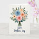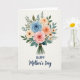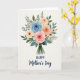 This greeting card features a softly painted bouquet arranged on a cream background, with petals that seem to lean toward each other like close friends sharing a quiet moment ❤️. Large, many-layered flowers sit at the center in light blue, pale pink, warm peach, and creamy ivory, creating a calm, romantic balance. Smaller star-shaped blooms in sunny yellow with darker centers scatter around them like little sparks of attention 🌼. Deep green leaves and thin fronds weave through the cluster, wrapping the flowers in a cozy, natural setting. The stems gather neatly at the bottom and are tied with a rustic brown twine bow. Centered beneath the bouquet, the text reads “HAPPY Mother’s Day,” with “HAPPY” in a classic serif style and “Mother’s Day” in a flowing cursive style. All the lettering is deep indigo, standing out clearly against the light background. The bouquet sits above the centered line of indigo text, with the twine bow just above the words.