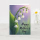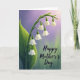 This card features a graceful spray of small, bell-shaped white blossoms hanging from a curved green stem that rises from the lower left and arcs upward with a gentle, caring tilt ❤️. A broad green leaf sits along the left side, adding texture and a grounded feel beside the delicate blooms. Soft, diffused lighting glides over the petals, and the tender droop of each flower suggests a quiet, affectionate closeness, like a warm embrace in nature. The background fades in a smooth gradient from misty lavender near the top to muted green toward the bottom, keeping the scene calm and springlike 🌼. Fine highlights and shadows give each blossom a smooth, porcelain-like depth without looking stiff. On the right side, the words “Happy Mother’s Day” appear in dark lettering, set slightly above center so the flowers still lead the eye. The text sits against the lighter part of the gradient, making it easy to read while staying softly integrated with the botanical artwork. The stem’s curve points toward the lettering, and the white bells cluster in the upper-left area with their tips facing downward.