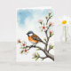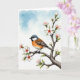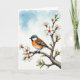This design shows a small songbird resting on a flowering branch, drawn in soft watercolor tones that feel gentle and affectionate ❤️. The bird has a blue-gray cap, bright white cheeks, a slim dark stripe under its beak, and a warm orange-rust chest that leans into deep brown along its back. Its glossy dark eye and calm posture suggest a tender, watchful pause, like it’s quietly keeping company with someone nearby. The branch is painted in earthy browns with textured strokes, giving it a steady, grounded look beneath the delicate blooms. White five-petaled flowers open along the branch with pinkish-red centers and tiny golden stamens, while a few buds stay curled as if waiting for a shared moment 🌼. Small fresh green leaves peek out between blossoms, adding a light springtime lift against the airy background. Any text would sit neatly in the open white space near the lower area in a muted gray or soft pink so it doesn’t compete with the illustration. Behind everything, the background fades from a translucent sky blue at the top into clean white toward the bottom.