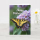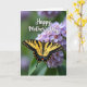 This greeting card features a close-up nature scene where a yellow-and-black striped winged insect rests neatly on a cluster of soft lavender flowers, like a gentle pause shared between old friends ❤️. The blossoms open in small layers, creating a calm little stage that draws your eye to the insect’s balanced wings. Behind them, the background fades into blurred greens with hints of purple, giving the moment a quiet, intimate feel. The lighting is soft and diffused, showing fine textures in the petals and the wing patterns without harsh shadows. Near the lower sections of the wings, tiny red and blue specks sit along the dark edges, adding a subtle surprise of color 🌼. The words “Happy Mother’s Day” appear across the upper area in white, flowing lettering that stands out against the darker greenery. The insect is centered over the blooms, with the text floating above and the purple flowers clustered toward the lower half of the design.