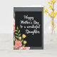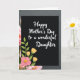 This card features a sleek black rectangular panel centered on the front, setting a calm, intimate tone like a quiet hug between close family members ❤️. Across the panel, the message “Happy Mother’s Day to a wonderful Daughter” appears in flowing white lettering, standing out clearly against the dark background. The text sits mostly centered, with generous spacing around it that keeps the focus on the words without feeling crowded. In the lower-left area of the black panel, a stylized floral drawing adds a gentle, affectionate touch, like a small bouquet offered with care 🌼. Green stems and leaves curl upward to support a pink blossom with a bright yellow center, while a few slender yellow buds rise alongside it. Around the panel, the background is softly blurred, with blush-pink petal shapes drifting along the left side and fading the edges into a tender, dreamy frame. The right side of the background shifts into a muted dark gray gradient, making the black panel and white lettering look even sharper.