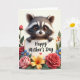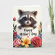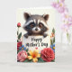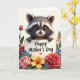 This card features a cute woodland animal with a dark mask-like face marking and soft, multi-toned fur peeking over a bright white sign, its amber eyes looking up with a tender, friendly sparkle ❤️. Its small paws curl over the top edge as if it’s leaning in close, like a gentle hug in picture form. Centered on the sign, the words “Happy Mother’s Day” appear in dark lettering, followed by a tiny pink heart near the end. Around the animal and sign, a thick border of flowers and leaves creates a cozy garden setting, with red and pink rose-like blooms opening in layers. Smaller blue flowers with yellow centers tuck between the larger petals, adding little pops of color, while a warm yellow-orange flower glows near one corner 🌼. Green leaves and a few orange berry sprigs fill the gaps, making the frame feel full and affectionate without looking crowded. Soft, diffused light highlights the silky petals and the animal’s fuzzy cheeks, and the white sign stands out clearly against the surrounding greenery. The floral frame includes red and pink blossoms, blue-and-yellow flowers, glossy green leaves, and clustered orange berries encircling the sign.