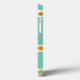 This phone case has a 1970s retro design of blue stripes interrupted by circles in brown, orange and green.