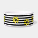 Pretty white ceramic dog food / water bowl, with a black and white horizontal striped pattern, around the outside. Graphics of big yellow flowers, run around the outside of the bowl. Yellow custom text, on the front, is ready to personalize, for your pet or as a great gift idea for any pet owner. Matching pet products are available.