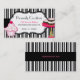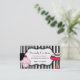 Pretty bakery business card done in a black and white striped background, with a black bold band, across the middle, and a decorative black edged white text area, on the front. Sweet graphics of a pink, white, and green cupcake and a cake stand with brownies, decorate either side, of the card. Text is fully customizable to suit your business needs. Great for at home bakers too.