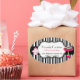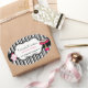 Pretty bakery business stickers done in a black and white striped background, with a black bold band, across the middle, and a decorative black edged white text area, on the front. Sweet graphics of a pink, white, and green cupcake and a cake stand with brownies, decorate either side, of the sticker. Personalize the pink and black text to suit your bakery needs.