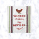 This kitchen towel has stripes along the length of both sides, a chicken and "Wicked chickens lay deviled eggs!" below it. Art Credit: RedPepper.