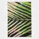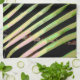 The striped tropical pattern on this Kitchen Towel was made from an original photograph by ZoeSPEAK of a royal palm frond in the sunshine, against a dark green background of pine trees. The contrast is strong between the dark background and the yellow green leaves with their salmon pink highlights, making this abstract design from nature look almost like an animal print.