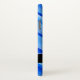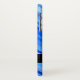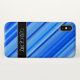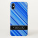 This phone case design features a pattern of stripes or lines colored various shades of blue. It also features a custom name within a dark colored band.