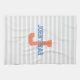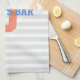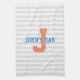 Gray and white striped bar towel featuring a large orange one letter monogram, in the middle, and blue text ready to personalize.