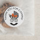 Halloween baby shower thank you stickers with a goth baby stroller in black and white stripes and a big orange bow above a spooky bat. Thank you for coming in a curved text arching over the Halloween-themed stroller adorned with an orange bow, perfect for a gender neutral baby shower set during Halloween. Put the thank you for coming stickers on the favors you're handing out at your goth baby shower!