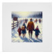 A family dressed for winter is walking towards a sign that welcomes them to Canada, with snow-covered ground and a fenced path. Other figures are seen in the distance, creating a sense of journey and exploration in a frosty landscape.