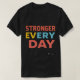 A vibrant t-shirt design featuring the phrase "Stronger Every Day" in bold, multicolored typography. The text is arranged in a dynamic and eye-catching layout, with each letter radiating a different, energetic hue. The overall design conveys a sense of strength, resilience, and positive growth.