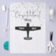 Simple black silhouette of an airplane with a black title "Congratulations" typography in calligraphy sprinkled with silver stars confetti. Personalize it with student pilot's name and first solo flight date. Remind them how proud you are of them, now go celebrate their first milestone!