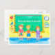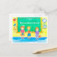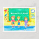 A fun "welcome back to school" postcard featuring three children in a classroom asked to stand in front of the class holding the letters to spell "cat illustrated with watercolor. You can customize the message to fit your needs.