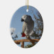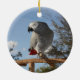 Pretty African Grey on a tree stand with her pretty gray feathers and red tail watching her surroundings outdoors against the blue sky and oak trees.